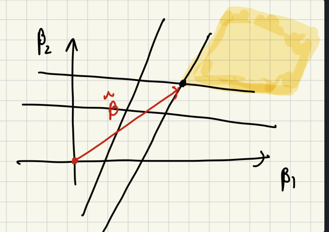 그리고 위의 식 조건에서 yiβ⊤xi≥1 식을 기하학적으로 살펴보면, 법선의 유클리드 거리 제곱을 최소화 하면서 데이터들과의 어떤 직선함수가 1보다 큰 것을 만족하라는것입니다. 그래서 데이터 수만큼의 직선이 생기고, 그중에서 1보다 큰 직선이 만드는 영역 중에서 β 의 유클리드 거리가 가장 작은 점을 고른다는 의미로 해석이 가능합니다.