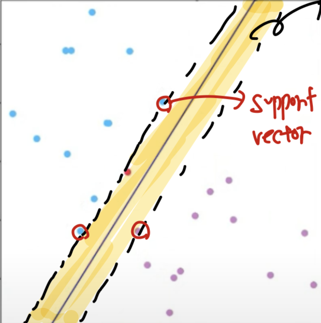 여기서 보라색이 hyper plane이고, 노란색으로 색칠된 부분이 Margine입니다. SVM의 목표는 해당 Margine을 Maximize하는 것입니다.