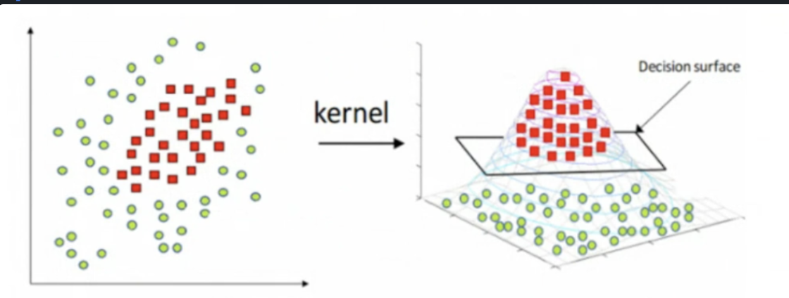 추가로 사진과 같이 Linear 하게 분리되지 않는 데이터들에 대해서는 kernel이라는 것을 도입합니다. kernel의 역할은 데이들을 마치 더 높은 차원으로 매핑 해서 분류하고 다시 원래 차원으로 되돌려 주는 역할을 수행합니다. ( 차원을 높히면 무조건 선형 분류가 가능해집니다 , 예를들어 N개의 데이터를 N차원에 두면 자연스럽게 모둔 차원이 분류가 가능하기 때문입니다. )