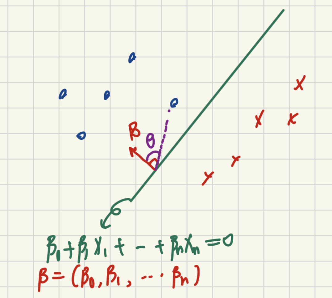 우선 데이터 포인트들이 만약 y=β0+β1x1+….+βpxp 로 정의 될 수 있다고 가정합시다. 그리고 β0+β1x1+….+βpxp=0 이 되는 hyper plane을 만들수 있습니다. hyper plane을 만드는 이유는 모든 지점이 0이 되는 hyper plane을 기준으로 위에 존재하면 양수값을 갖고, 아래 존재하면 음수 값을 같기에 이를 기준으로 데이터를 분류하게 되면 서로 다른 두 클래스를 구분할수 있기 때문입니다.