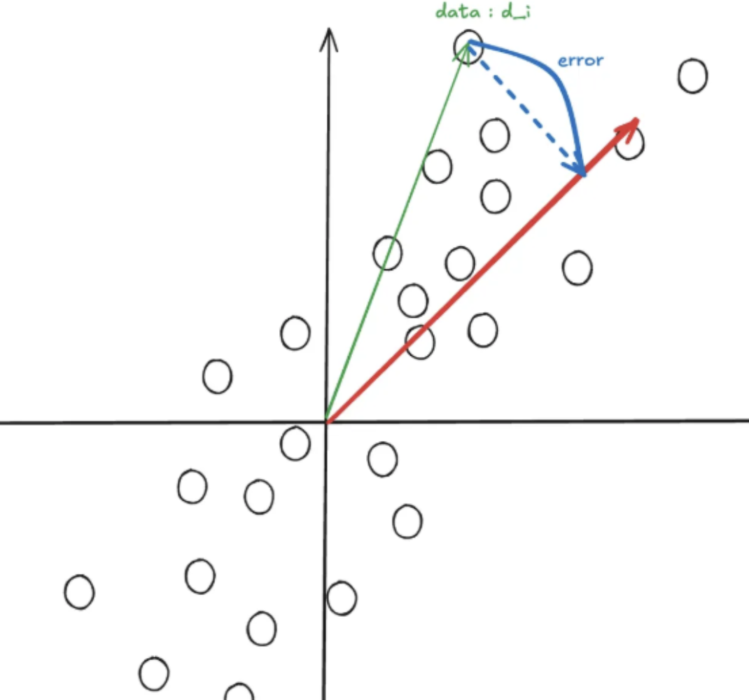 다음과 같이 해당 데이터를 가장 잘 설명하는 빨간색 vector가 존재한다고 합시다. 이때 임의이 x에 대해서 빨간 vector와의 차이를 구하게 되면 파란색처럼 error vector를 구할수 있게 됩니다. PCA는 이렇게 error vector의 크기를 최소하하는 방법입니다.