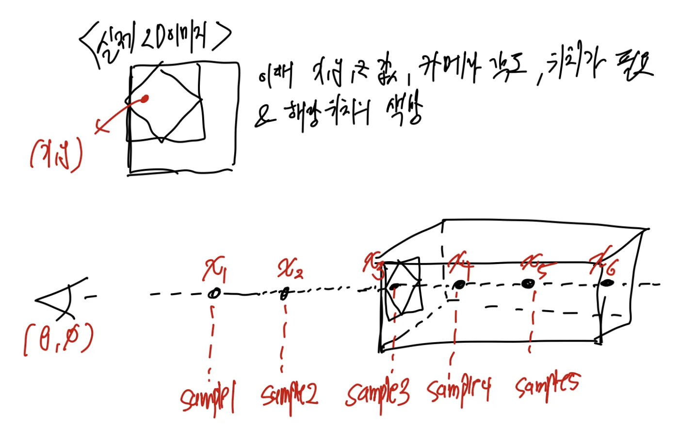 그래서 학습시에 각 이미지에서 특정 (x,y,z)를 샘플링 합니다. 그리고 해당 좌표가 속할 수 있는 광선을 고르게 됩니다. ( 해당 좌표를 볼 수 있는 카메라의 각도 )