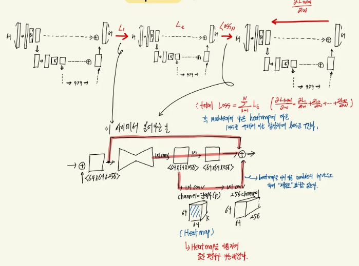 이미지가 최대 폴링에 도달하게 되면 최근접 이웃 방식을 통해서 특징맵을 업샘플링하게 됩니다 ( 예를들어 4 4 feature map → 8 8 feature map ) 그리고 이전의 레이어에서 나온 feature map과 element wise하게 더해지게 됩니다 ( skip connection ). 이러한 방식을 통해서 이미지를 업샘플링 해주게 됩니다. 그리고 최종 출력 단계에서는 최종 feature map 에 1 1 conv 를 2개 거치며 다음 레이어로 넘어가며, Hourglass 모듈이후 1 1 conv거친 후 관절의 수와 동일한 차원을 갖는 Heat map을 생성하게 됩니다. Heat map을 통해서 Module의 중간중간에서 손실을 구할 수 있게 됩니다. 이러한 방식을 Intermediate supervision 이라고 합니다. 본 논문에서는 Intermediate supervision 방식을 활용하여 높은 수준의 정확도를 달성 할 수 있었다고 주장합니다.