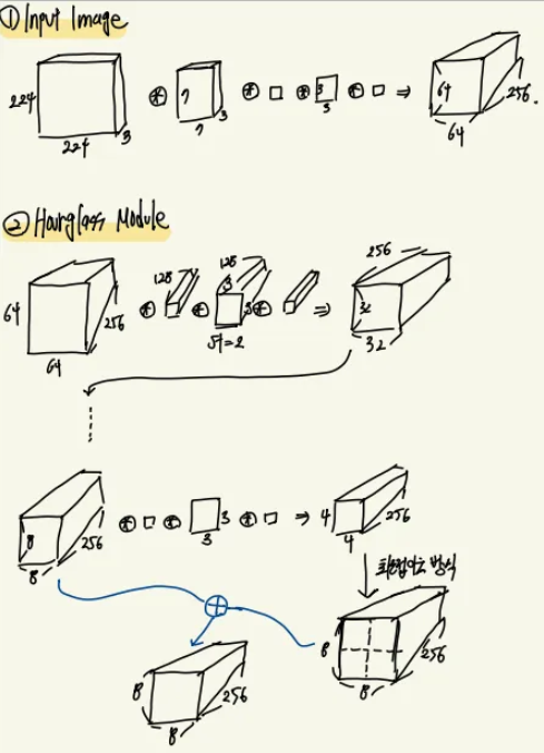 Stacked Hourglass 논문은 Hourglass 형태의 다운-업 샘플링 과정을 통해서 여러 스케일의 이미지 특징을 한번에 처리하였습니다. 이는 이후 Feature pyramid와 비슷한 방식으로 FPN이 알려지기전 굉장히 효과적인 아이디어로 보입니다. 추가로 중간 손실을 사용하여 stacked 된 모듈마다 이를 재검토하는 방식을 통해서 다양한 특징과 패턴을 학습할 수 있었습니다.