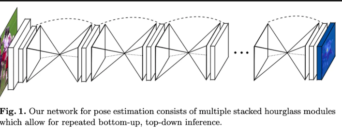 본 논문에서는 위에서 설명한 Hourglass module을 여러개 쌓는 구조를 활용하였습니다. 반복적인 구조를 통해 추론을 하게 되면 이전의 결과가 다음의 입력으로 들어가게 되며 추가로 이전의 결과를 재검토하는 효과를 얻을 수 있다고 설명합니다. 그리고 중간 마다 Heat map을 생성하여 Intermediate supervision을 통해 지역적 정보 그리고 글로벌 정보를 모두 학습한다고 주장합니다. 본 논문에서는 최종적으로 8개의 Hourglass 모듈을 사용하였다고 합니다.