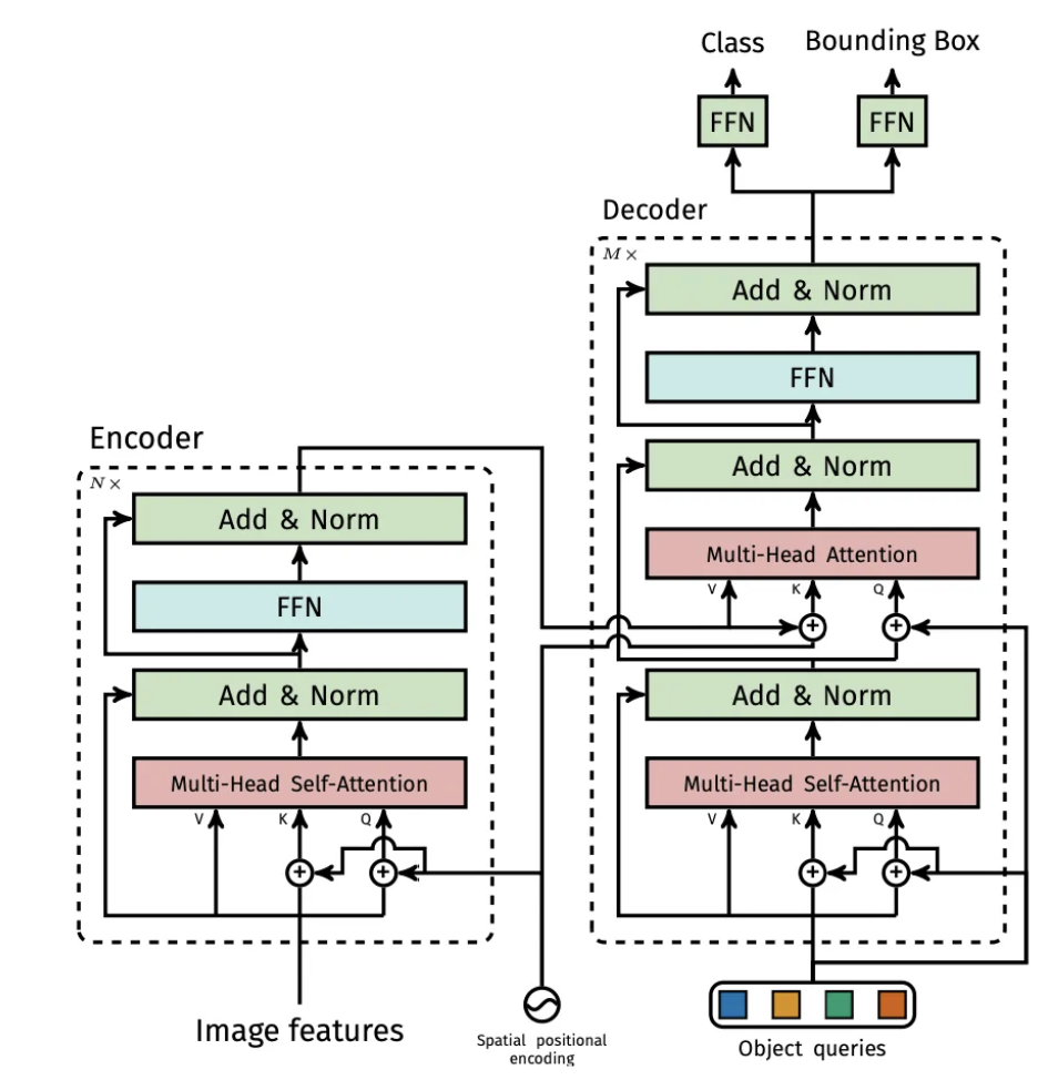 흐름 : 입력으로는 이미지의 Feature map이 들어오게 됩니다. 그리고 이미지의 feature map을 통해서 Encoder에서 이미지의 전체적인 문맥을 파악하게 됩니다. 그리고 Deocder의 입력으로는 무작위로 초기화된 N개의 입력이 들어오고 그들 끼리 attention을 진행하게 됩니다. 그리고 그 이후 Encoder Deocder attention을 통해서 문맥 정보가 담겨지고 최종적으로 각각의 FFN통해서 N개의 클래스 정보과 박스 정보가 나오게 됩니다.
