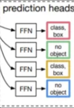FFN의 경우 2개의 브랜치로 나뉘어집니다. 하나는 3계층으로 구성된 MLP 층이며, 해당 층에서는 정규화된 박스의 중심, 너비, 높이를 예측하게 됩니다. 그리고 다른 하나는 1계층의 선형 레이어이며 softmax를 통해서 클래스의 라벨을 예측하게 됩니다. 그리고 객체가 없다는 것을 표현하는 은 일종의 배경으로 처리가 되게 됩니다.