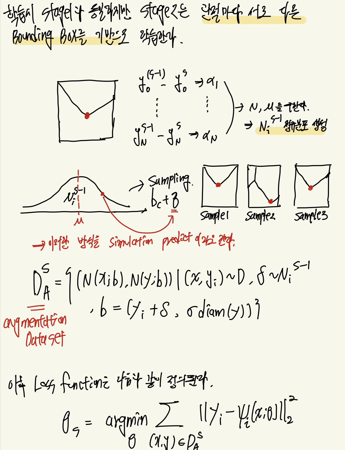 손실 함수를 구하기전에 stage1과 stageN ( N ≥ 2 ) 의 중요한 차이가 있습니다. 이는 모든 이미지의 박스의 크기가 다르다는 것입니다. 그래서 각각의 박스로 정규화가 필요하게 됩니다. 그리고 본 논문에서는 값들을 사용하여 모든 관절의 오차를 통해서 평균과 분산을 통해서 특정 정규분포를 설정하게 됩니다. 그리고 이러한 분포에서 값들을 샘플링하게 되어 실제 정답에 더해주게 됩니다. 이를 통해서 실제 없는 데이터지만 box 자체를 조금씩 이동시켜 데이터 증강 효과를 얻었다고 합니다. 이를 수식으로 표현하면 아래와 같이 나타낼 수 있습니다.