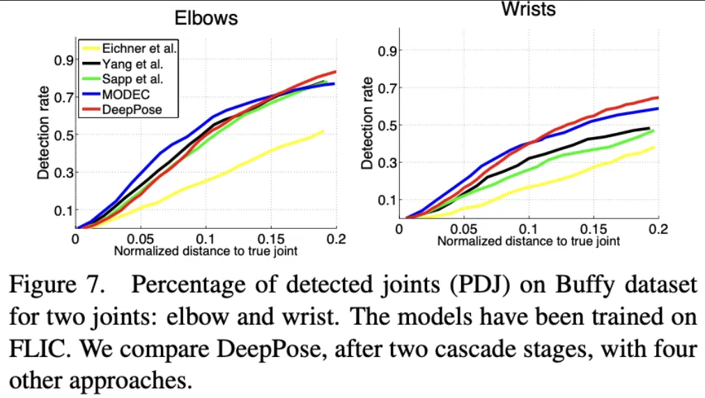 단순히 7계층을 갖는 신경망을 통해서 각각의 관절을 Regression 형식으로 예측하게 됩니다. 이렇게 정식화된 모델을 사용함으로 써, 이미지 전체의 문맥을 파악할 수 있으며, 기존의 모델들 보다 매우 간단하게 모델을 설계할 수 있습니다. 추가로 Cascade 방식을 체택하여 점진적으로 해상돌들 높혀 정확도를 올리는 방식을 사용하였다고 제안하고 있습니다.