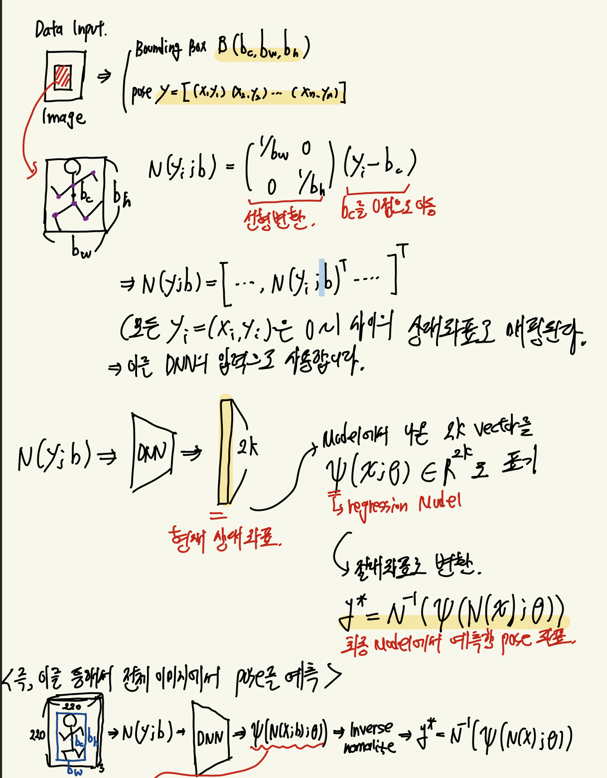 그리고 해당 는 (x,y) 로 2개의 좌표값을 가지고 있습니다. 하지만 단순히 이미지 내에서 절대 좌표를 활용하게 되면 다른 이미지와의 관계를 파악하기 불리합니다. 그래서 본 논문에서는 이미지 내 사람을 감싸는 박스를 함께 제공하게 됩니다. 그리고 박스 내 존재하는 각 관절의 좌표를 정규화 하게 됩니다. 이를 통해서 모든 좌표값은 0 ~ 1 사이의 값을 갖도록 됩니다. 이를 통해서 모든 이미지들은 상대적 좌표를 활용하기에 모델이 관절 위치 패턴을 보다 쉽게 파악할 수 있도록 유도합니다. 이를 수식화 하면 아래와 같이 나타낼 수 있습니다.
