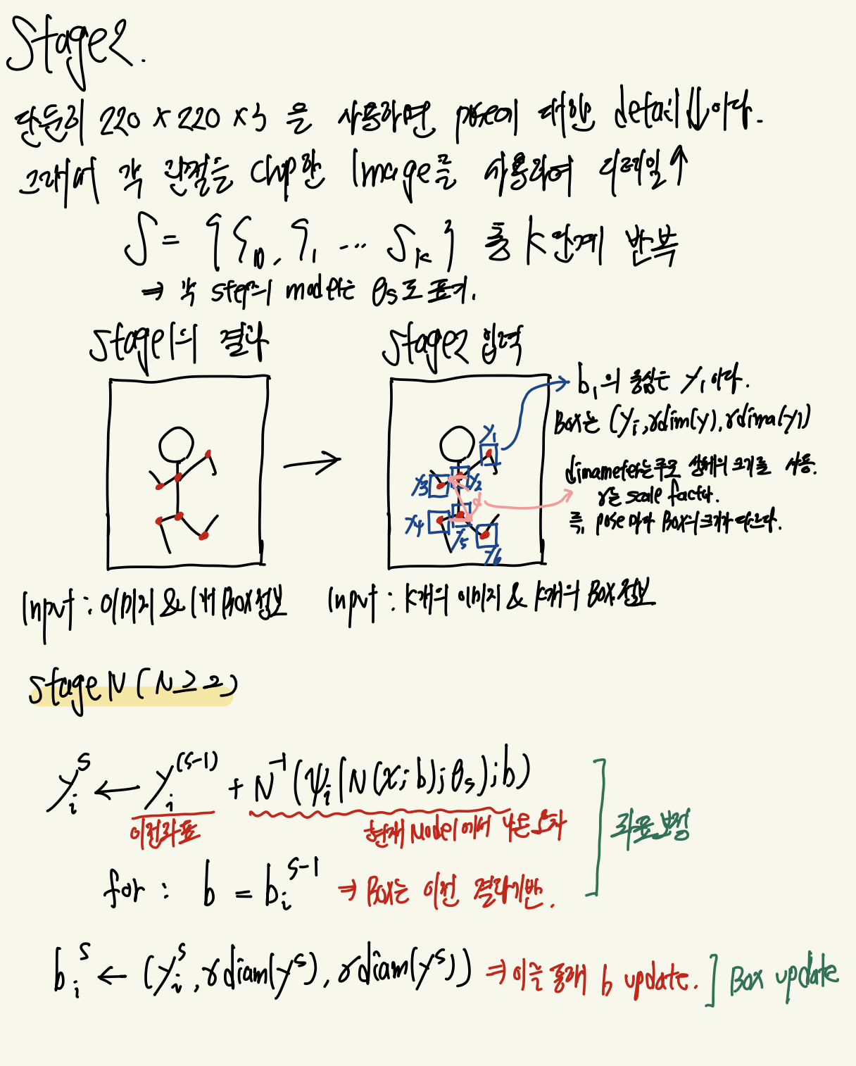 그래서 결국 stage1의 경우 우리가 위에서 봤던 수식을 그대로 따르고 2단게 이후로는 각각의 관절을 crop한 데이터를 다루기 떄문에 아래와 같은 수식으로 표현이 가능하게 됩니다.