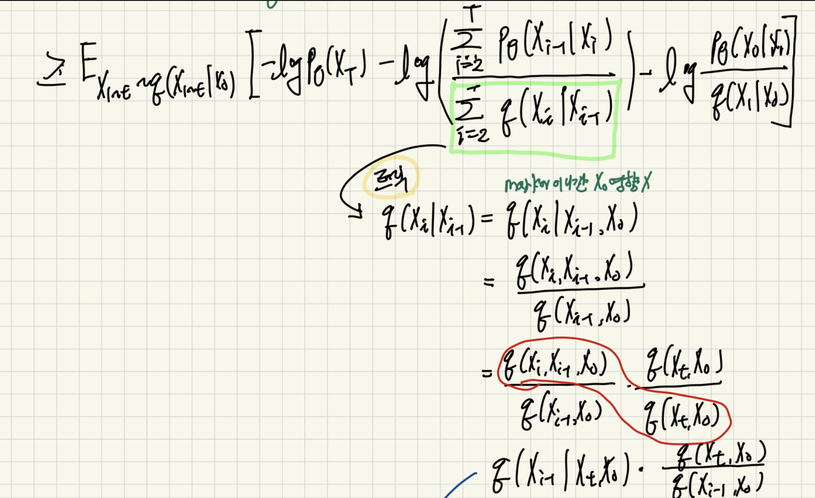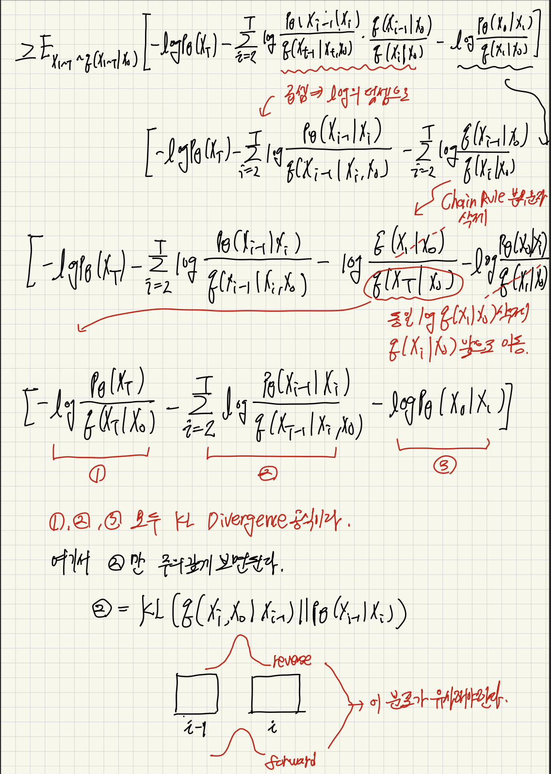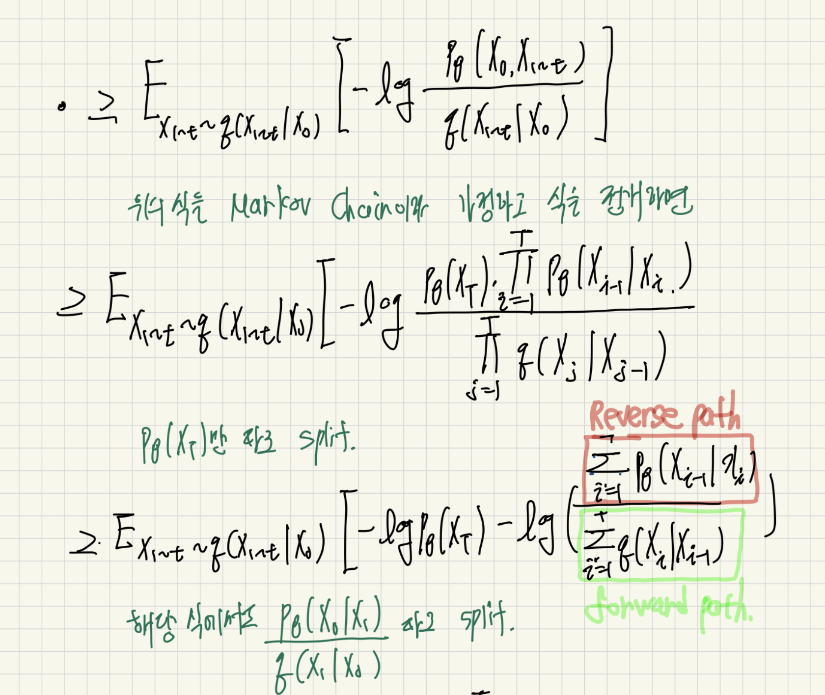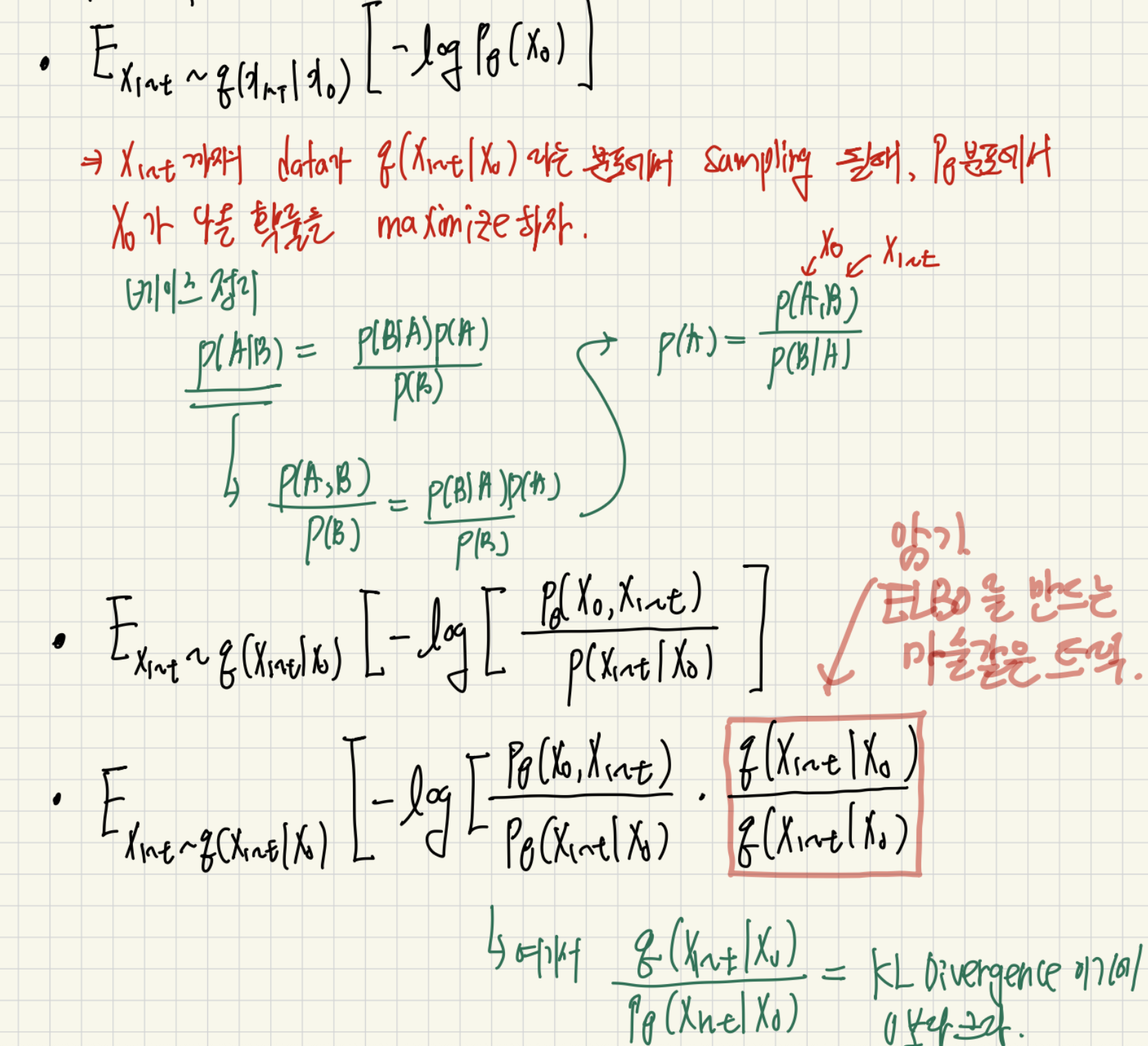 그 의문을 해결하기 위해서 아주 기나긴 수학 공식을 풀어보겠습니다. 한가지 딱 중요하게 기억하고 갈 것은 결국 우리의 목표는 을 최대화 하는 것입니다. 즉 forward path에서 x들이 q라는 가우시안 분포로 샘플링 되었을때, p라는 평균을 모르는 가우시안 분포에서 원본 이미지가 나올 가능성을 최대화하자!! 입니다. 직관적으로도 이해가 잘 될것이라고 생각합니다.