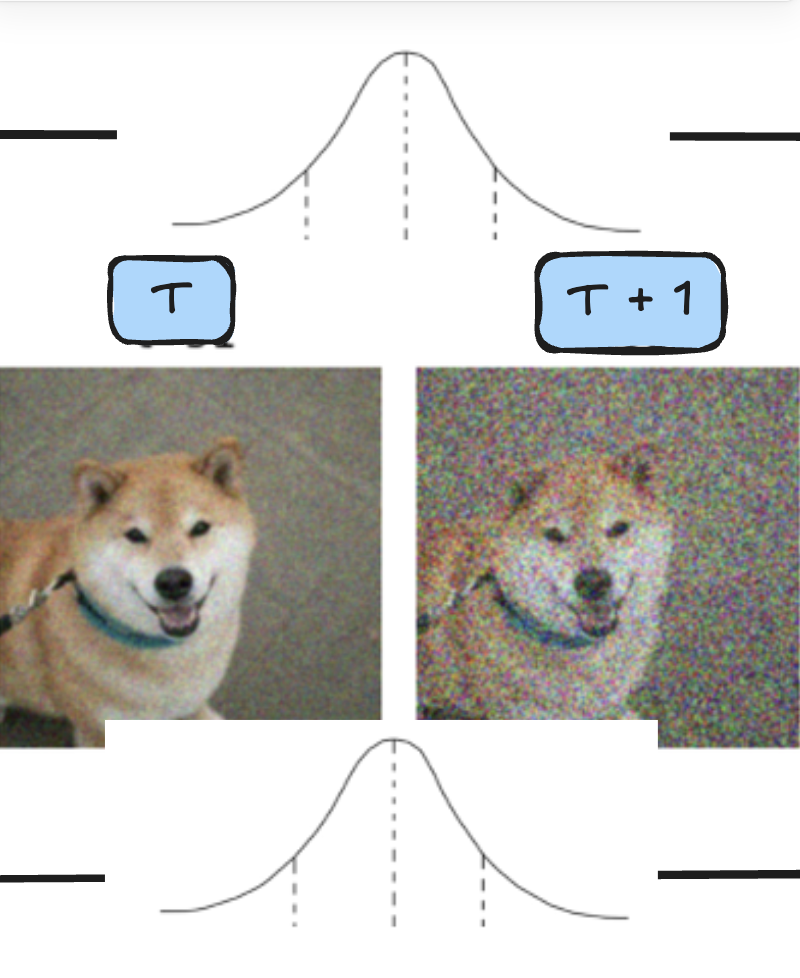 그래서 위의 식을 통해서 얻은게 무엇인가?? 우리가 p라는 reverse 분포에서 원본 이미지가 나올 가능성을 가장 높히기 위해서는 같은 시간 t에 대해서 forward의 분포와 reverse의 분포를 최대한 비슷하게 만들어야 한다!! 는 결과를 얻게 되었습니다. 아래 사진 처럼 T와 T + 1 사이의 Gassuian이 비슷해야된다! 를 의미합니다.