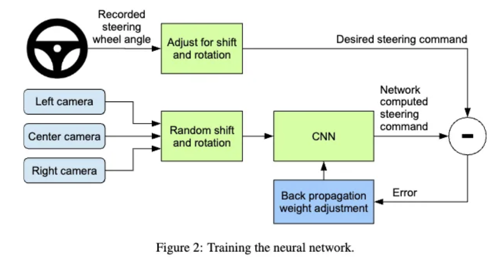 차량이 중앙선에서 벗어나는 경우는 왼쪽 카메라와 오른쪽 카메라를 통해서 확인할 수 있으며, 다양한 각도의 상황을 가정하기 위해서 가까운 카메라에서의 이미지를 변형시켜 마치 차량이 이동한것 과 같은 효과를 내어 데이터를 증강하였습니다. 그리고 3D 이미지를 활용해야 정확한 변형을 할 수 있지만, 해당 프로젝트에서 3D 데이터를 얻지 못하기 때문에, 단순히 모든 점들이 수평선 아래 존재한다고 가정을 하더라도 큰 문제가 없었다고 합니다. 그래서 최종적으로 학습을 하는 프로세스는 위의 그림과 같습니다. 카메라로 부터 얻은 이미지로 부터 핸들의 각도를 모델이 예측하도록 하고, 실제 핸들 각도와 비교하여 파라미터를 업데이트 하는 식으로 학습하게 됩니다. 즉, 각 이미지에 맞는 핸들 각도를 학습하게 하여 각 상황에 맞는 판다을 하도록 유도하게 됩니다.