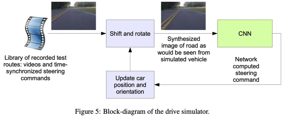 훈련된 CNN을 실제 도로에서 테스트하기 전에, 시뮬레이션을 통해서 성능을 테스트 했습니다. 우선 사람이 운전하는 데이터 수집 차량의 전면 카메라로 부터 영상을 얻고, 만약 자율주행을 하는 경우 해당 화면에 나타났을 화면을 생성하도록 하였습니다.