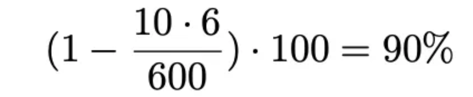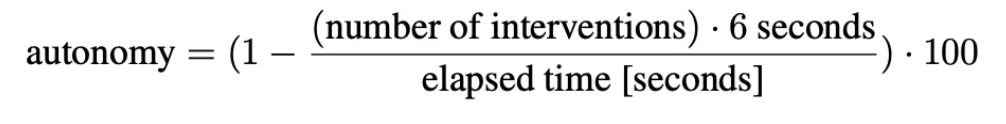 즉, 이를 통해서 최종적으로 차량이 스스로 운전한 시간을 백분위로 나타내어 평가할 수 있게 됩니다. 만일 600초의 시간 동안 운전을 하는 도중 총 10번의 사람의 개입이 있었다고 가정 하게 된다면 다음과 같이 자율주행 90% 를 얻을 수 있게 됩니다.