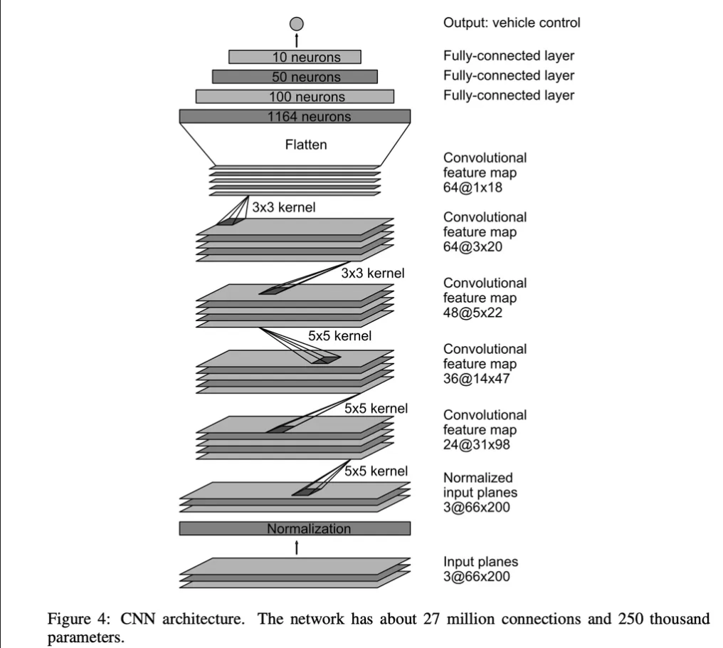 본 논문에서 사용하고 있는 아키텍처는 위의 그림과 같이 총 9개의 레이어로 구성됩니다. 정규화, 5개의 conv 레이어 그리고 3개의 FC 레이어로 구성됩니다. 이미지의 경우 YUV로 변환되어 아키텍처에 들어갑니다. ( 많은 카메라 센서, 영상 장치가 디지털 영상 신호를 YUV 형식으로 출력하기 떄문에 RGB 보다는 YUV 포멧을 활용합니다. 또한 밝기 및 색상 분리에 따른 인지 안정성이 높다고 합니다. )