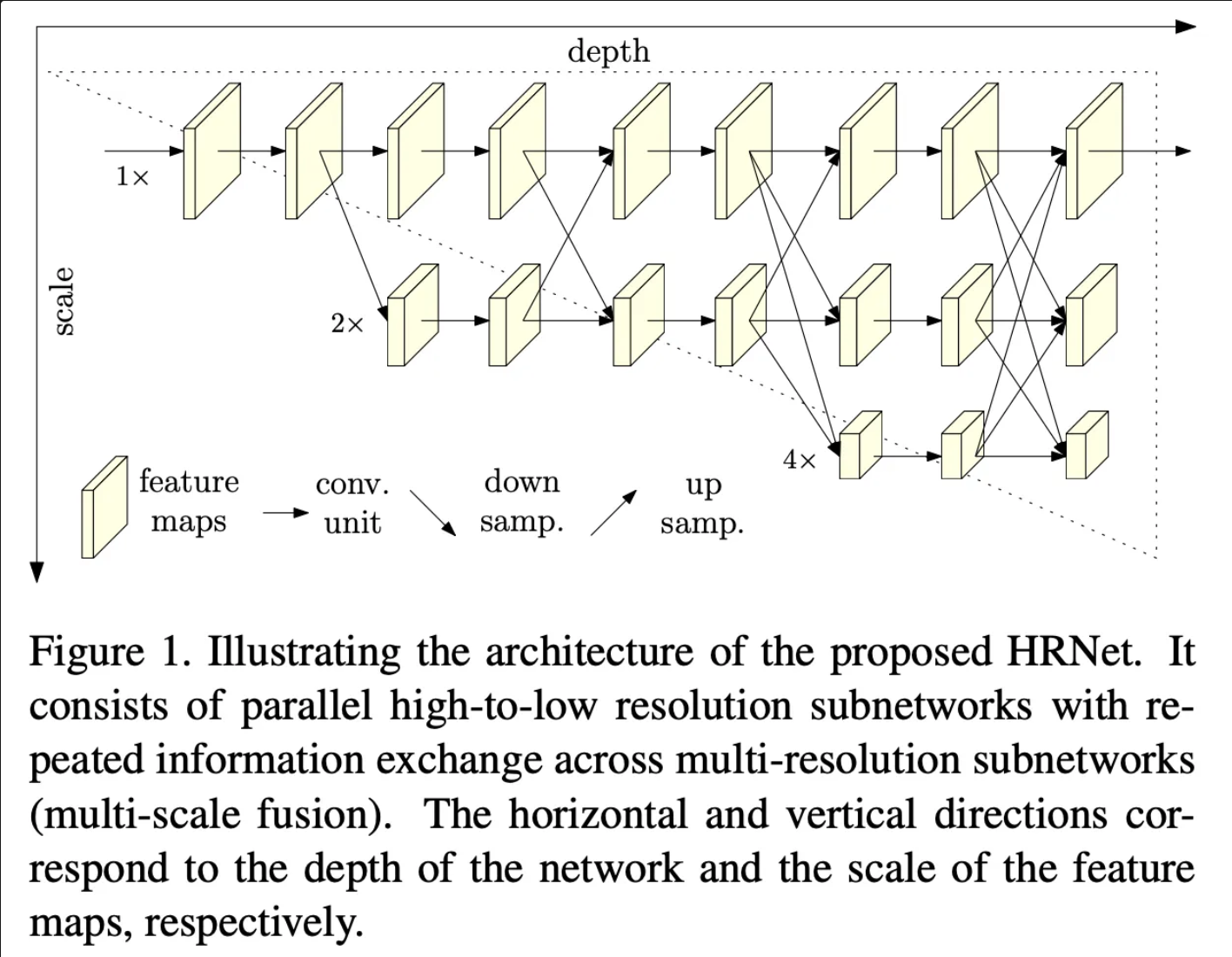 즉, 동시에, 서로 다른 스케일의 특징들을 반복적으로 융합하여, 고해상도 정보를 보강하고 저해상도 특징의 도움을 받음으로써 최종적으로 고해상도 이미지 기반의 pose estimation을 수행할 수 있는 모델을 제안합니다.