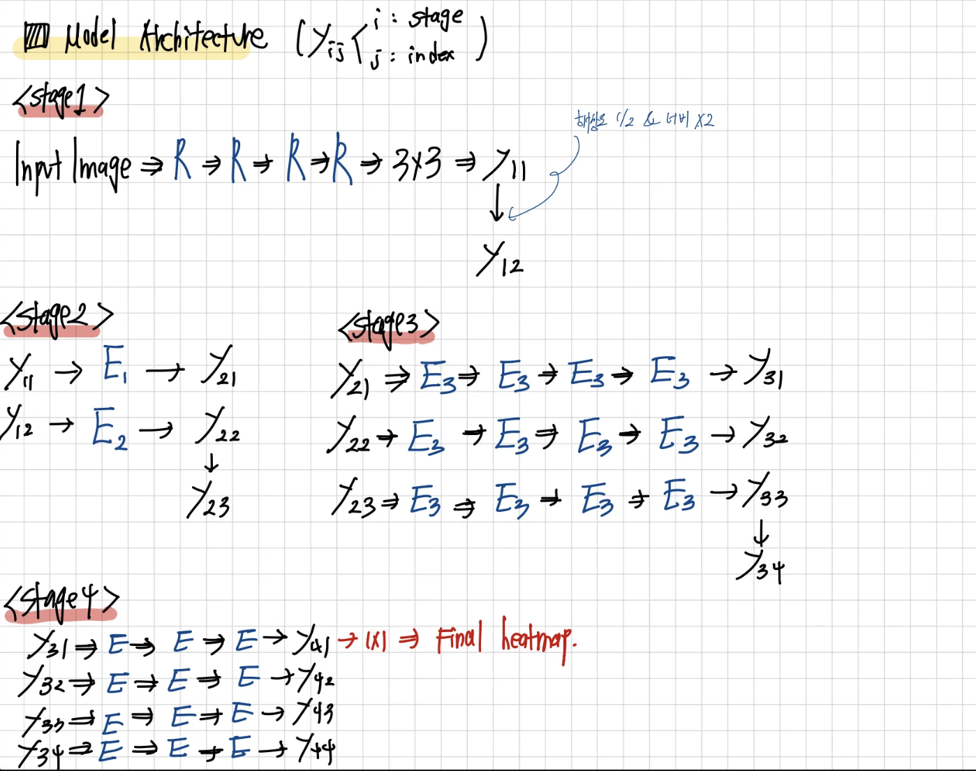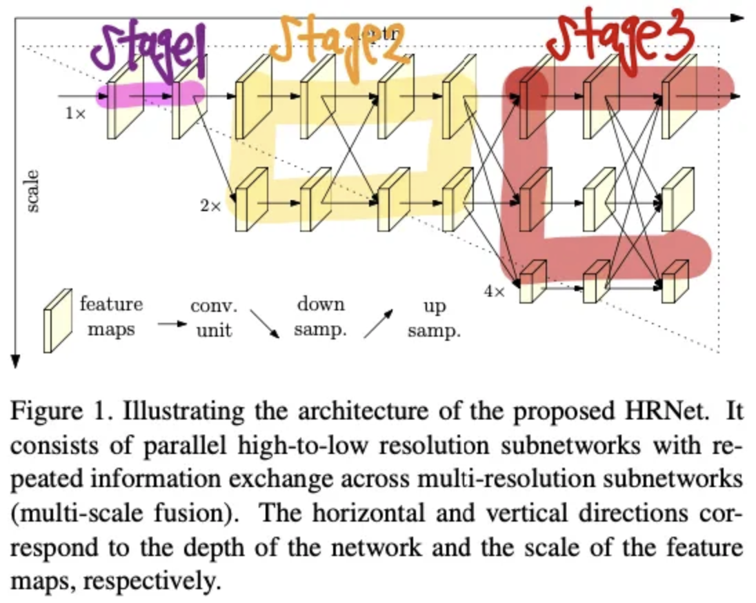 여기서 Nij 로 표현되는데, j가 동일한 경우 동일한 해상도를 갖는 subnetwork임을 의미합니다. 그리고 i는 각각의 스테이지를 의미합니다. 이러한 구조를 통해서 고해상도의 공간적 정보를 유지하면서도 동시에 저해상도의 특징을 융합하여 정밀도를 높히는데 기여할 수 있습니다.
