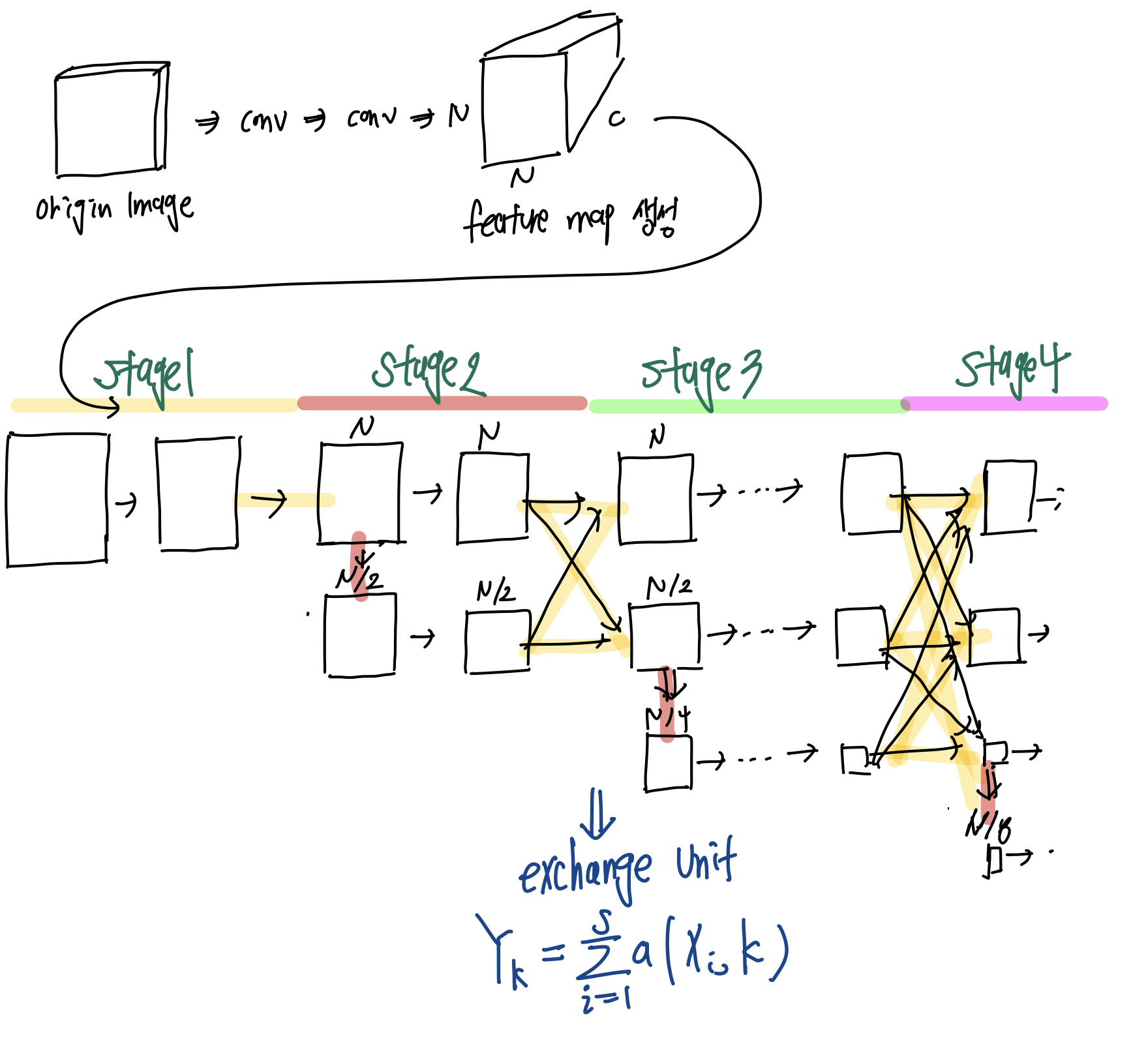 그리고 다음 2,3,4 스테이지의 경우 Exchange block으로 구성되는데, 각 Exchange block의 경우 총 4개의 Residual block으로 구성된 후 exchnage unit을 실행합니다. 그리고 2,3,4 스테이지는 각각 1,4,3 개의 Exchange block으로 구성됩니다. 이를 통해서 총 8번 exchange unit을 통해서 서로 다른 스케일의 정보가 섞이게 됩니다.