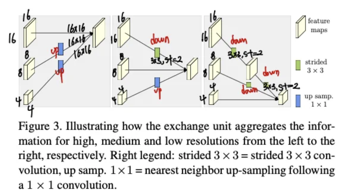 그래서 (3) 에서 표현하는 것은 결국 figure1의 stage3를 의미하는 것이다. 그리고 결국 서로다른 3개의 스케일을 입력으로 받아 융합한 후, 다음 블럭의 입력으로 전달해주는 역할을 하는 것이 Exchange Unit 이다.