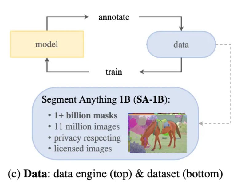 마스크로 라벨링된 이미지가 웹 상에 많이 존재하지 않기 떄문에, 해당 프로젝트에서는 1.1B 개의 마스크된 이미지를 얻기 위해서 본 프로젝트만의 data engine을 구축하였습니다. data engine은 총 3단계로 구성됩니다.