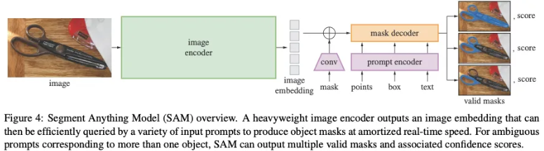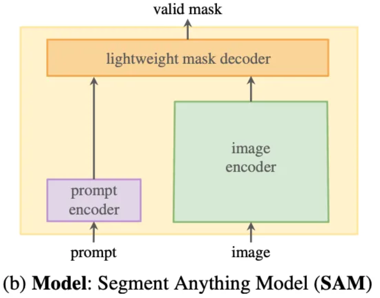 본 논문에서는 SAM 이라는 모델로 위의 3가지 문제점을 간단하게 해결한다고 합니다. 강력한 이미지 인코더로 입력 이미지로 부터 임베딩을 생성하고, 프롬포트 인코더로 프롬포트를 인코딩 한다고 합니다. 그리고 이미지 임베딩과 프롬포트 임베딩을 결합하여 최종 분할 마스크를 예측한다고 합니다. 그리고 이미지 인코더와, 프롬포트 인코더, 마스크 디코더를 분리함으로써 재사용성을 극대화 하였다고 합니다.