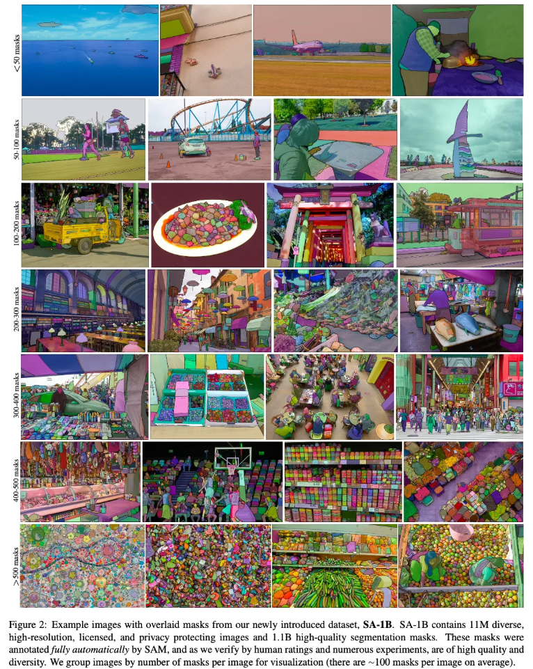 최종적으로 구축된 데이터셋인 SA-1B는 11백만 개의 라이선스가 부여되고 개인정보 보호를 준수하는 이미지에서 10억 개 이상의 마스크를 포함하고 있습니다. SA-1B는 데이터 엔진의 마지막 단계를 통해 완전히 자동으로 수집되었으며, 기존의 어떤 분할 데이터셋보다 400배 많은 마스크를 보유하고 있습니다.