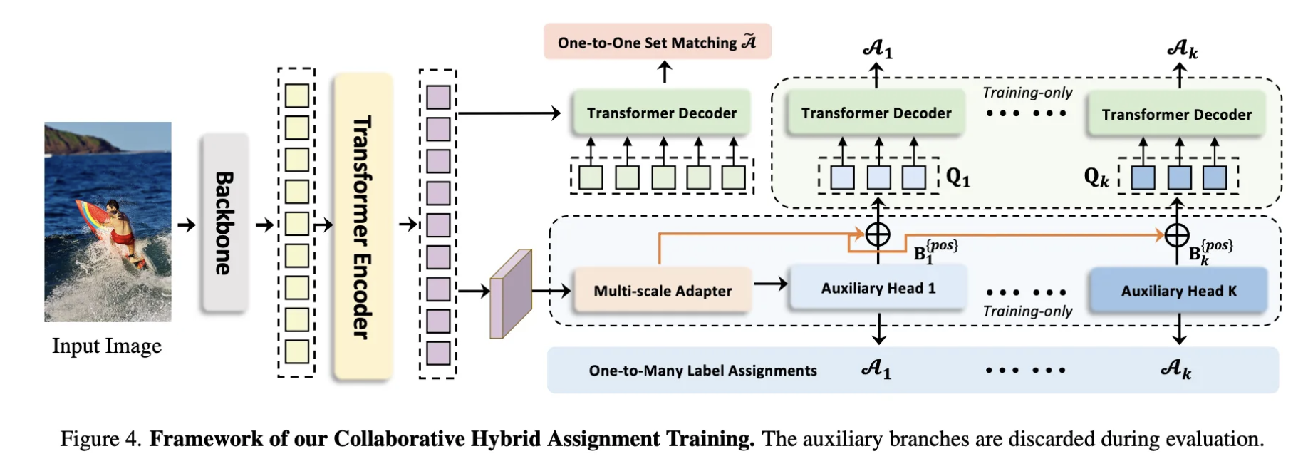 학습시 보조 병렬 헤드를 추가하여 1 : N 매칭을 사용하였고, 보조 헤드에서 양성 쿼리를 추가하여 Decoder의 성능을 개선하였습니다. 추론시에는 추가적인 파라미터와 연산을 필요로 하지 않습니다.