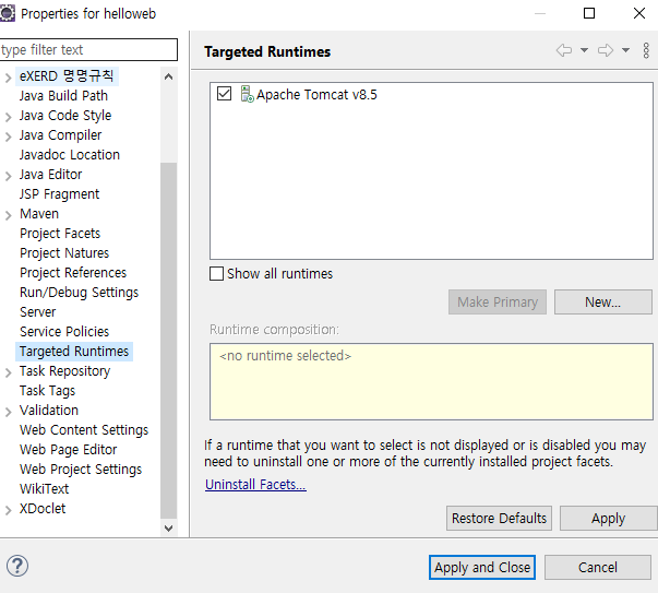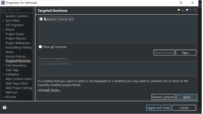 hello.JSP의 런타임이 톰캣으로 설정되면서 오류가 사라진다.