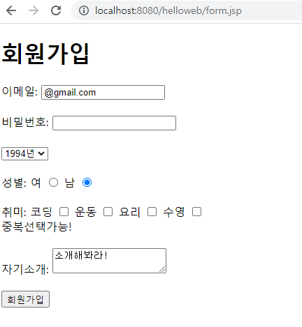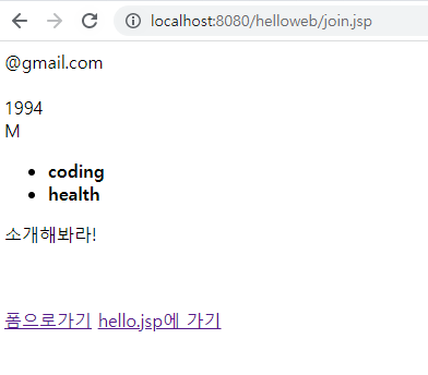 %> // HTML문서내의 자바 영역hello.jsp에 가기 -> 클릭시 작성한name값과 email 값이 hello.jsp페이지로 넘어간다.