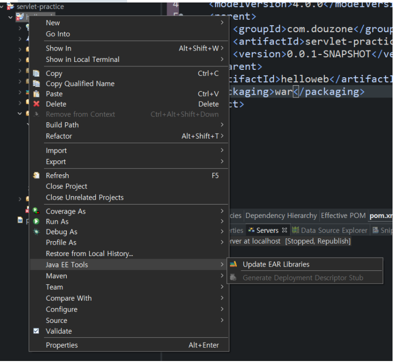 WEB-INF를 생성하기 위해 emaillist01 프로젝트를 우클릭 후 Java EE Tools - Generate Deployement Descriptor Stub 클릭한다