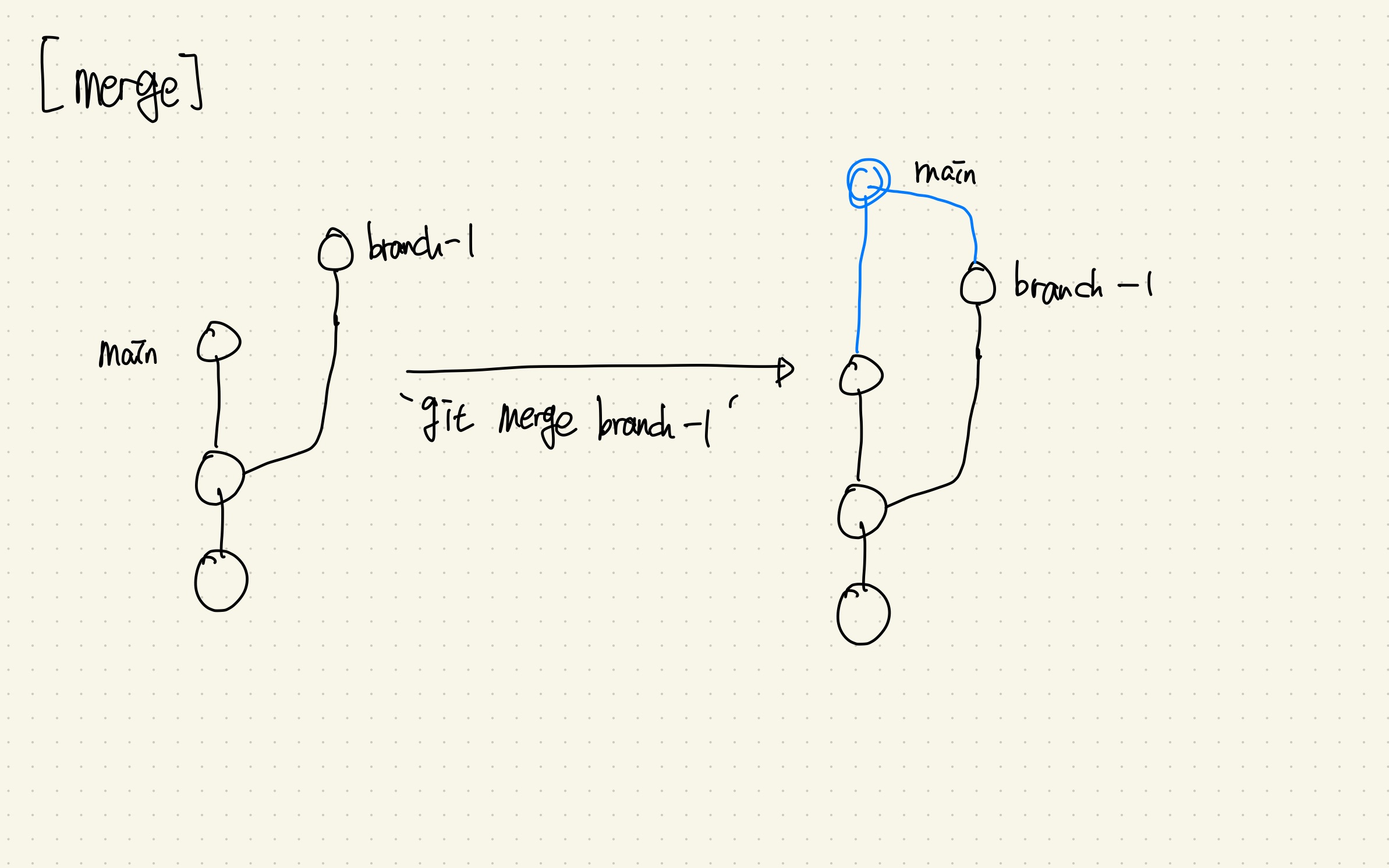 main 브랜치로 branch-1 브랜치를 병합하고 싶다면, main브랜치로 이동한 후, git merge branch-1을 입력해야한다.