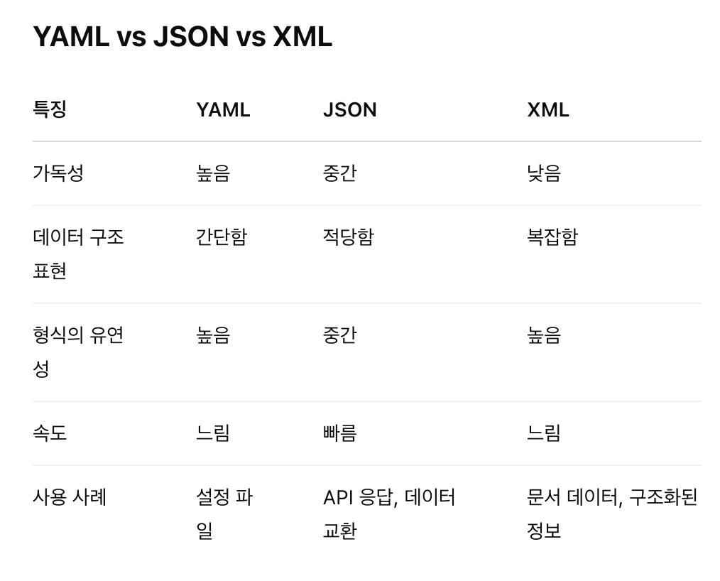 설정 파일: YAML (가독성 좋음, 사람이 직접 수정하기 쉬움)