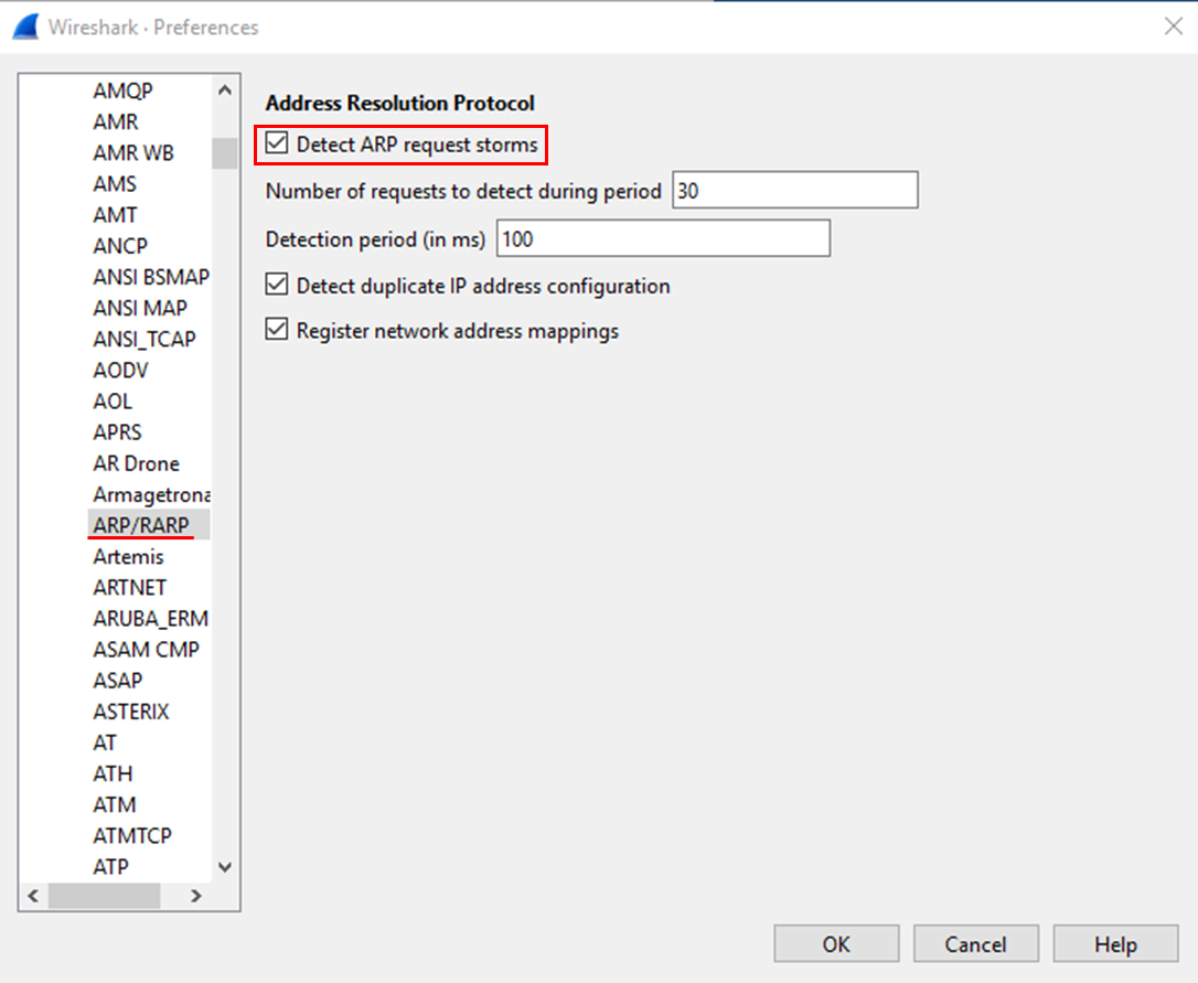 Edit > Preferences 또는 Ctrl + Shift + P 해서 ARP/RAPA 카테고리에 Detect ARP request stroms 을 체크한다.