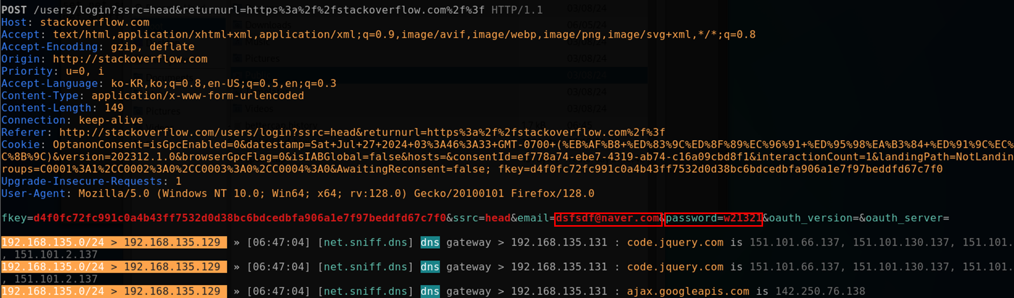 이후 타겟 컴퓨터에서 stackoverflow.com 으로 접속해서 로그인을 해보면 아래와 같이 아이디와 패스워드까지 알아낼 수 있다.