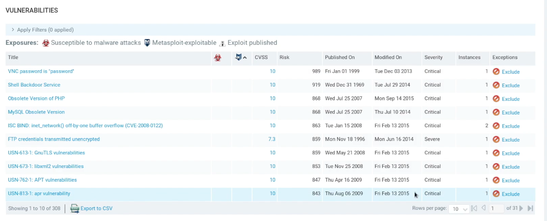 아래로 스크롤을 내려가보면 취약점들을 살펴볼 수 있으며 위험 순으로 정렬되어 있다.