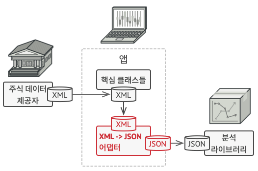 4) 어댑터는 클라이언트와 서비스 양쪽에서 작동할 수 있는 클래스로, 서비스 객체를 래핑하는 동안 클라이언트 인터페이스를 구현합니다. 어댑터는 어댑터 인터페이스를 통해 클라이언트로부터 호출들을 수신한 후 이 호출을 래핑된 서비스 객체가 이해할 수 있는 형식의 호출들로 변환합니다.