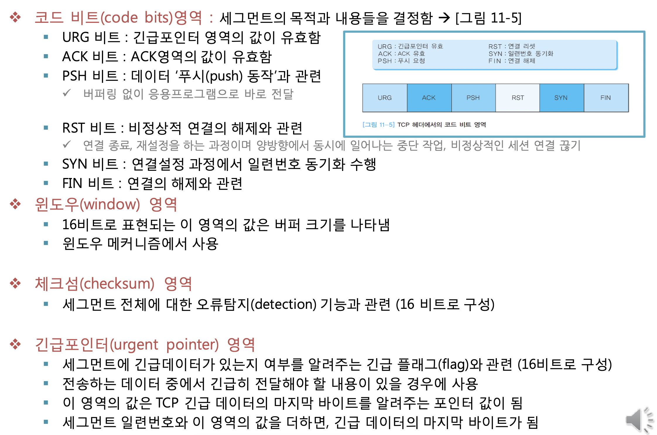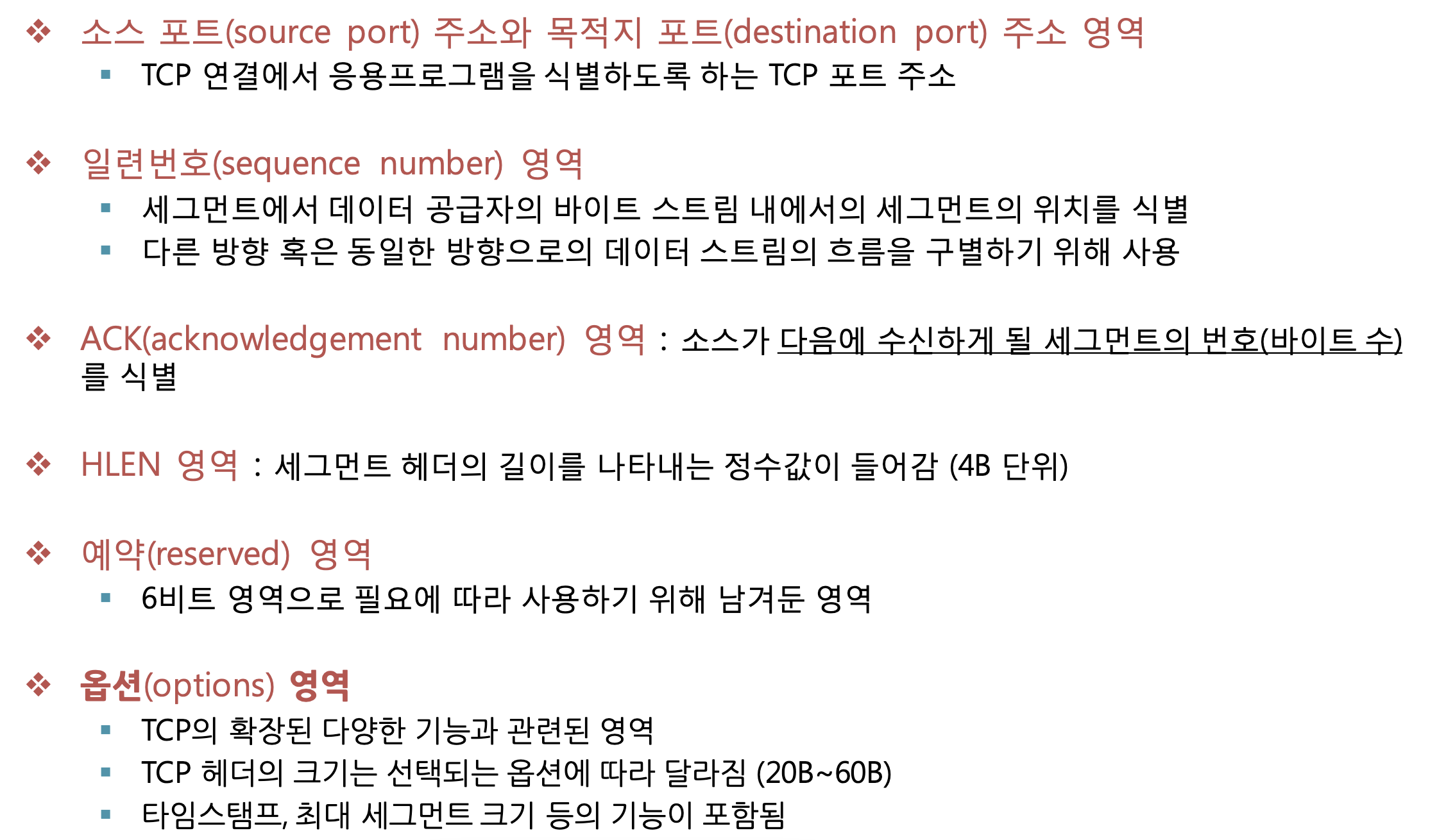 TCP 포트 번호, TCP 제어 플래그, 데이터의 순서와 무결성을 검사하기 위해 사용되는 숫자 값