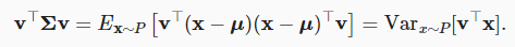 모든 선형 함수에 대한 분산을 계산할 수 있다. 대각선을 벗어난 요소는 좌표가 얼마나 상관관계가 있는지 알려주며, 값이 0이면 상관관계가 없음을 의미하고, 양수 값이 클수록 상관관계가 강하다는 것을 의미한다.