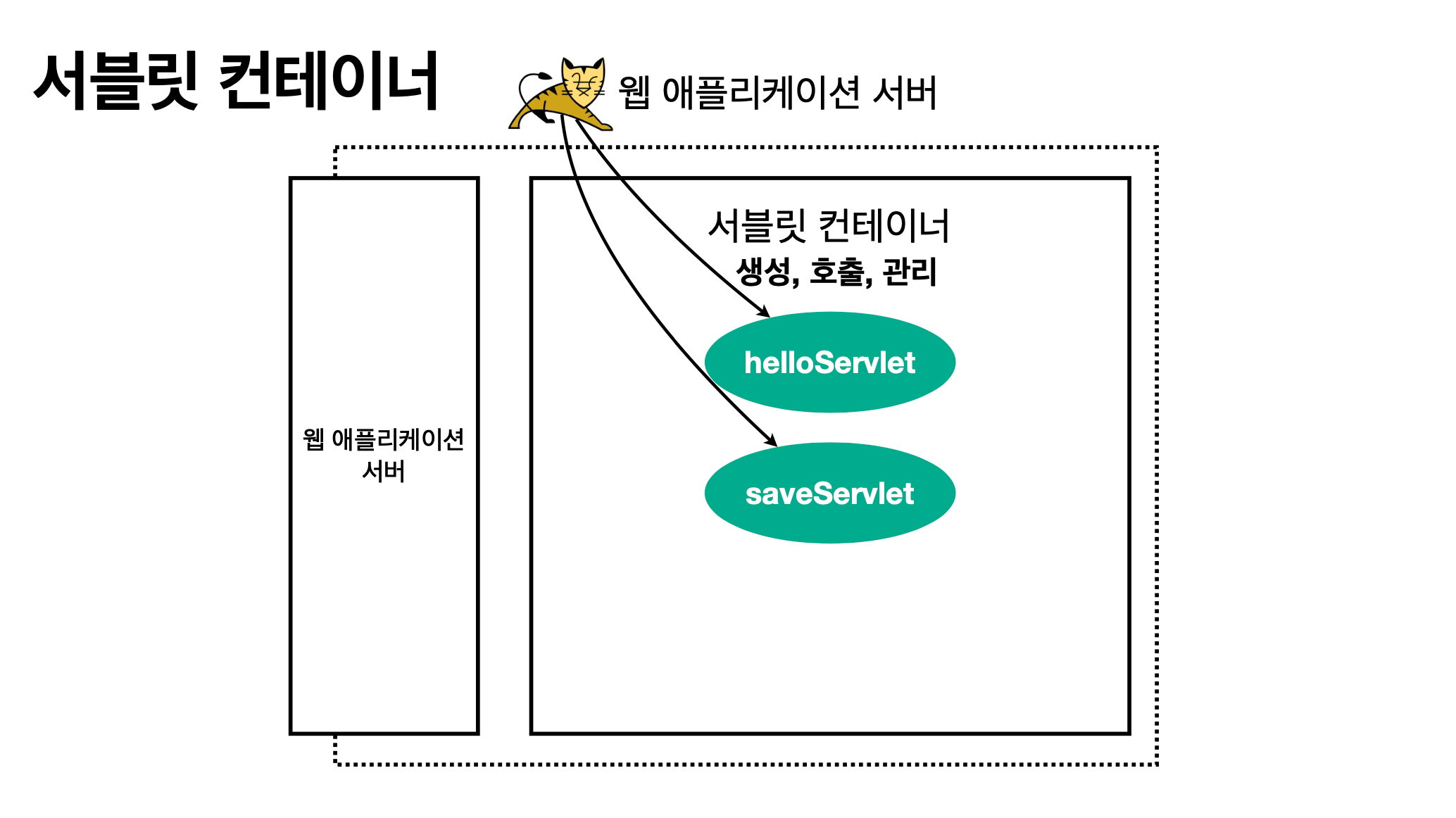 - 서블릿 컨테이너는 서블릿 객체를 생성, 초기화, 호출, 종료하는 생명주기를 관리