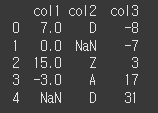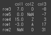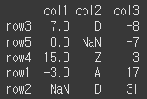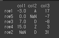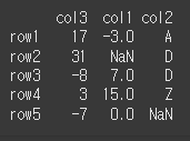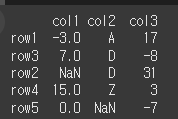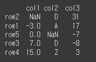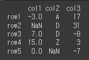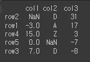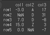 na = np.nan data = [[-3,'A',17], [na,'D',31], [ 7,'D',-8], [15,'Z', 3], [ 0, na,-7]] col = ['col1','col2','col3'] row = ['row1','row2','row3','row4','row5'] df = pd.DataFrame(data = data, index = row, columns= col) print(df)