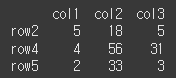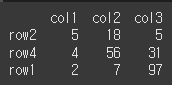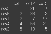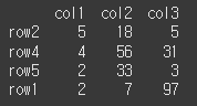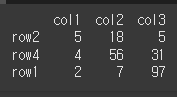 먼저 간단한 5x3짜리 DataFrame를 생성해보겠습니다.col = ['col1','col2','col3'] row = ['row3','row5','row1','row4','row2'] data = [[ 1, 21, 7], [ 2, 33, 3], [ 2, 7,97], [ 4, 56,31], [ 5, 18, 5]] df = pd.DataFrame(data=data, index=row, columns=col) print(df)