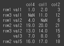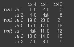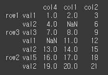 먼저 np.NaN이 포함된 간단한 multi index 데이터를 만들어보겠습니다.na = np.nan index_tuples = [('row1', 'val1'), ('row1', 'val2'), ('row3', 'val3'), ('row3', 'val1'), ('row3', 'val2'), ('row2', 'val5'),('row2', 'val2')] values = [ [1,2,3], [4,na,6], [7,8,9], [na,11,12], [13,14,15], [16,17,18], [19,20,21]] index = pd.MultiIndex.from_tuples(index_tuples) # 인덱스 설정 df = pd.DataFrame(values, columns=['col4', 'col1', 'col2'], index = index) print(df)