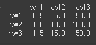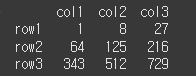 data = [[1,10,100],[2,20,200],[3,30,300]] col = ['col1','col2','col3'] row = ['row1','row2','row3'] df = pd.DataFrame(data=data,index=row,columns=col) print(df)