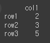 data2 = [[2],[3],[5]] df2 = pd.DataFrame(data=data2,index=['row1','row2','row3'],columns=['col1']) print(df2)