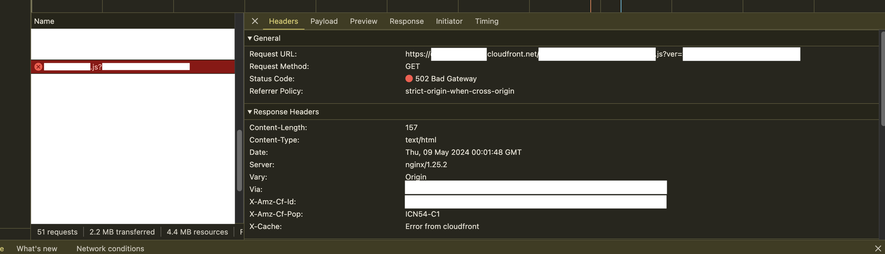 CloudFront를 통해 정적 리소스를 제공하던 중 50 Bad Gateway 오류가 발생했습니다. 이 오류는 ALB를 Origin으로 설정했을 때 주로 나타났어요. 서버가 아직 완전히 기동되지 않은 상태에서 CloudFront가 정적 리소스를 요청하면, 서버 상태가 "Healthy"로 표시되더라도 실제로는 비정상 상태이기 때문에 오류가 발생하게 됩니다.