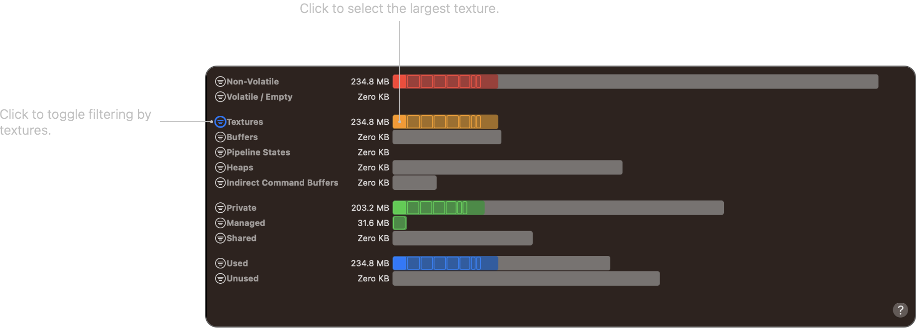 특히 텍스쳐 메모리 사용량을 추적하고, 측정된 시점에 메모리에 로드된 모든 텍스쳐의 정보를 확인해볼 수 있기 때문에 의도되지 않은 텍스쳐의 로드나 잘못 적용된 포맷과 사이즈가 있는지 쉽게 체크해볼 수 있다.