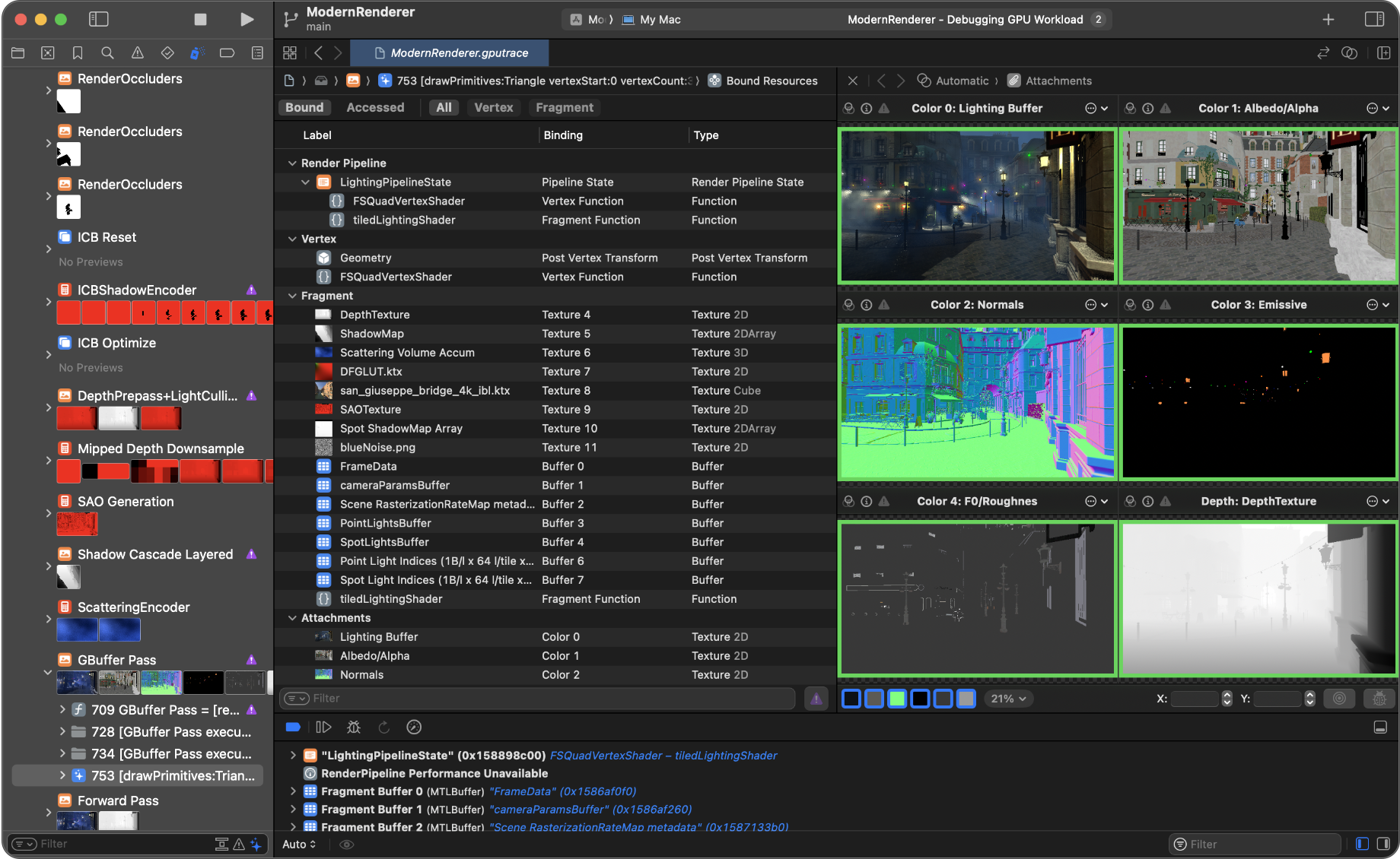 엔진에서 제공하는 프로파일러 외에, iOS에서 메탈 렌더링을 사용한다면 XCode 메탈개발자도구를 사용할 수 있다. 렌더링과 관련된 여러 프로파일링 정보를 체크해볼 수 있다.